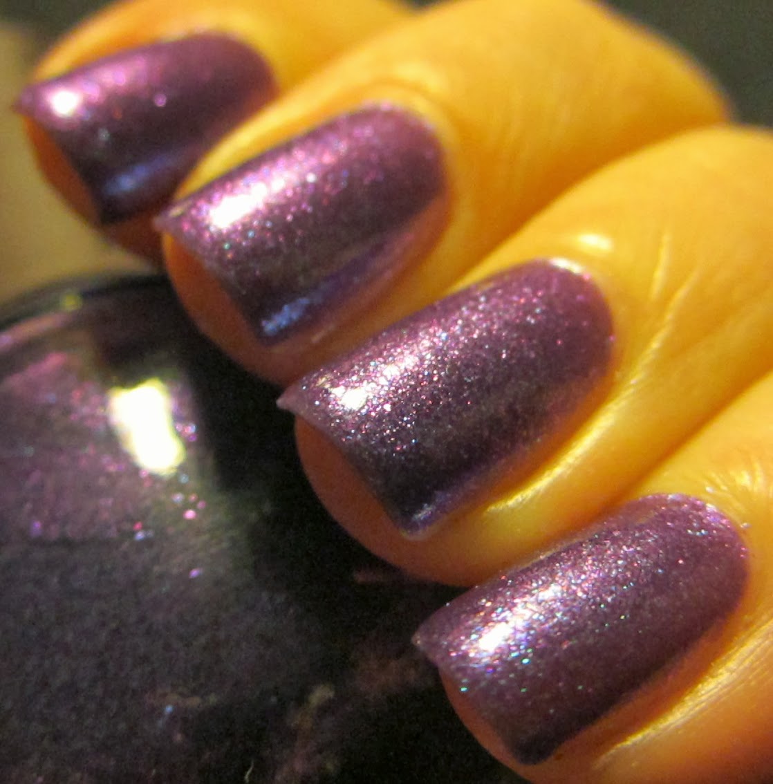 3 coats no topcoat. This is a strong linear holo with pinky purple/green duochrome.